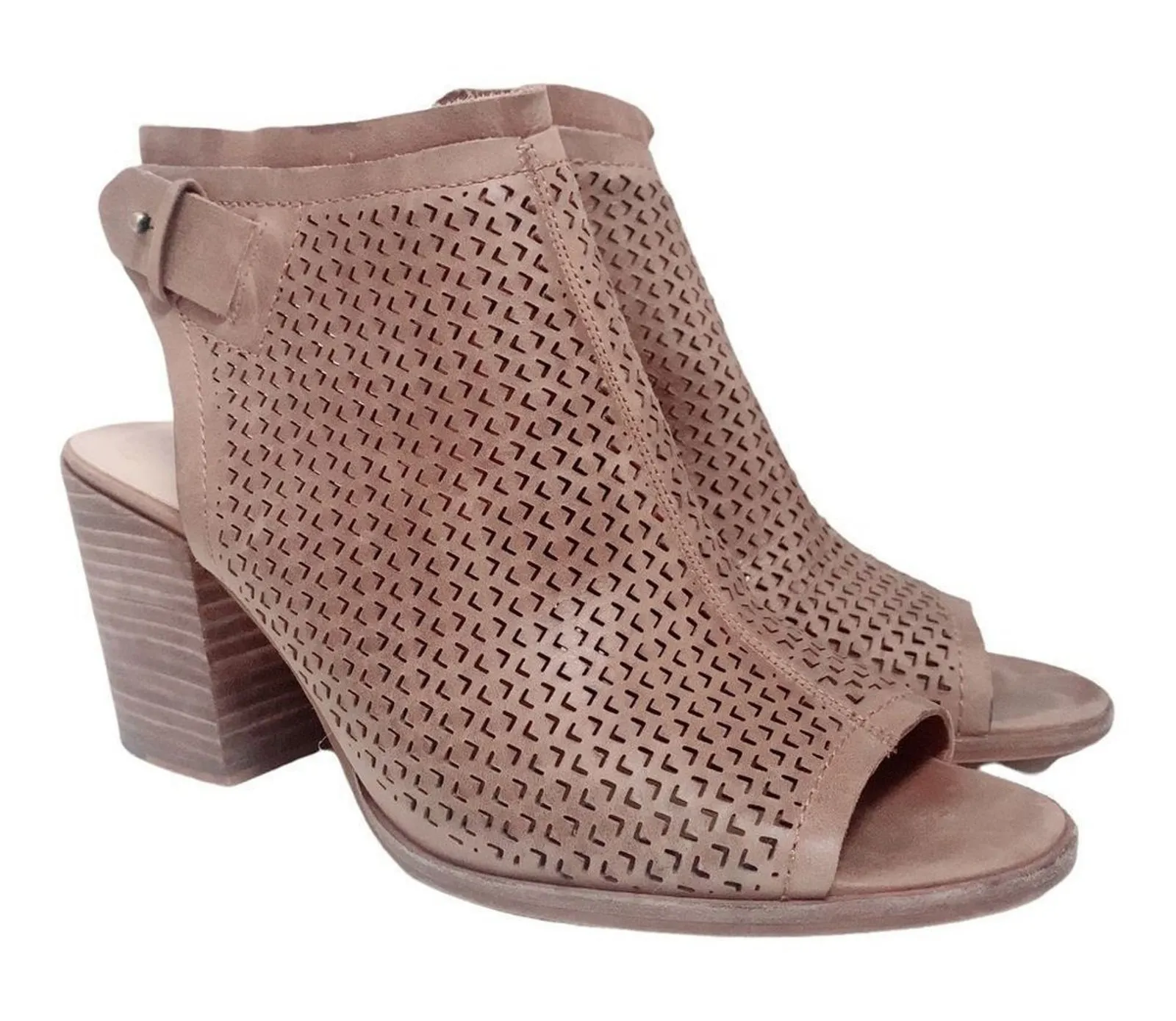 VINCE CAMUTO Liddie Open Toe Leather Block Heel Sandal 9.5 Lazer Cut Zippy Strap Brown - $35 - From Jenns