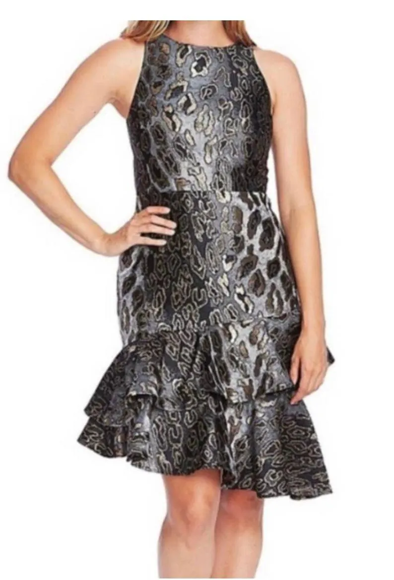 Good condition Vince Camuto Metallic Cheetah Asymmetrical Layered Hem Jacquard Sheath Dress Features... Show more