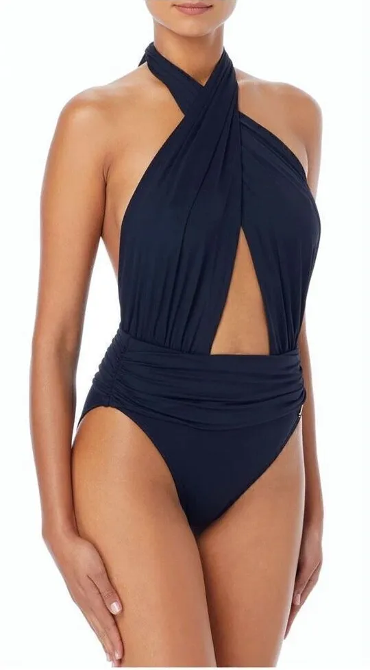 Show some skin in the Vince Camuto Wrap Halter Neck One Piece Swimsuit with a sexy open back. A brig... Show more