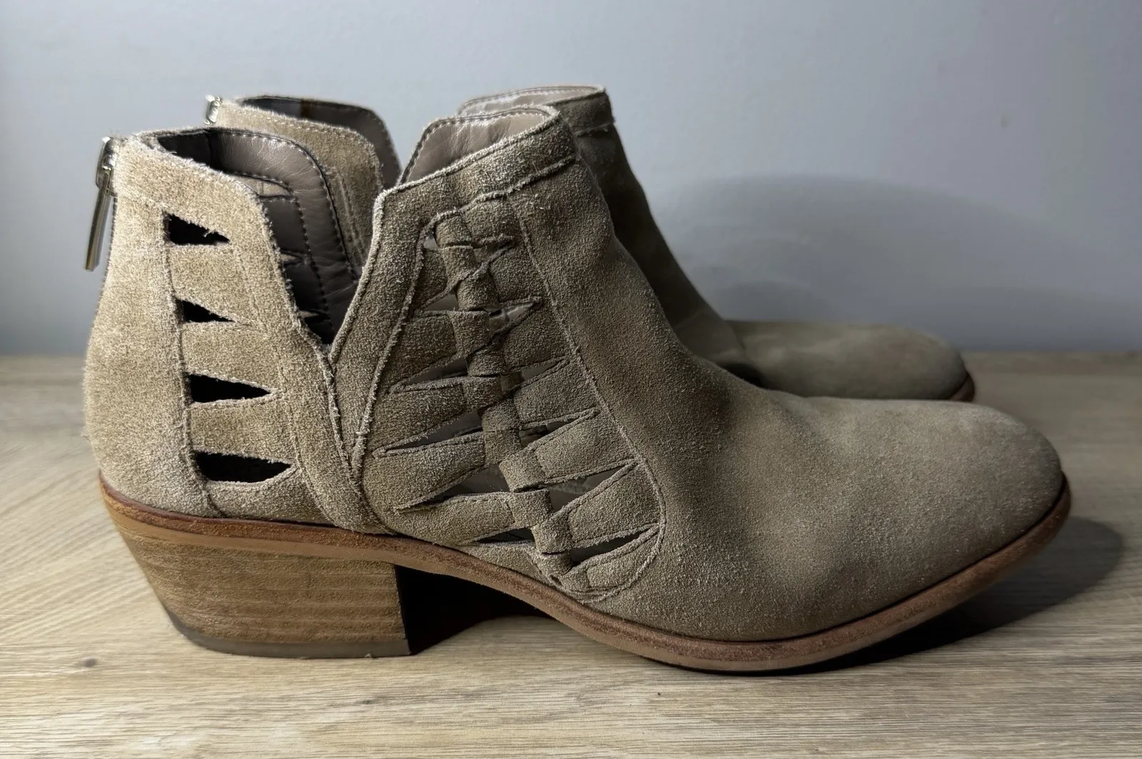 Vince Camuto, taupe booties, tan ankle boots, cutout sides, v-neck vamp, stacked block heel, side zi... Show more