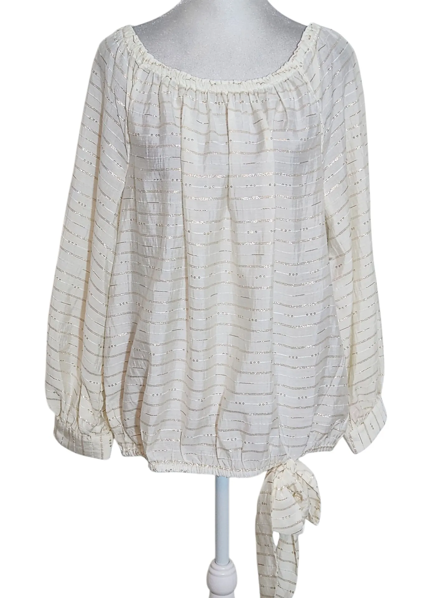 Vince Camuto sheer boho cream top with metallic gold accents, tie on the side, and elastic at the ne... Show more