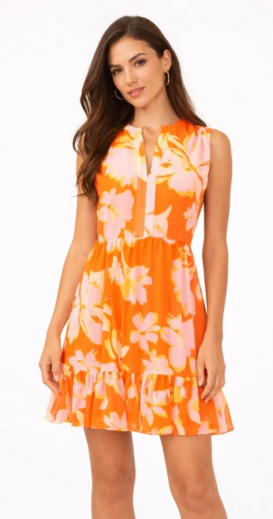 Keywords: Vince Camuto dress, floral dress, orange dress, sleeveless dress, ruffle hem dress, summer dress, casual dress, party dress, vacation dress, womens dress, floral print, mini dress, v neck dress, tiered dress