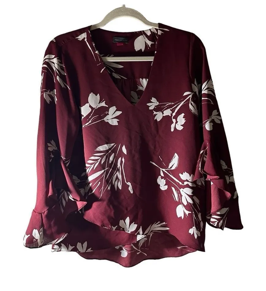 VINCE CAMUTO Woman's Maroon Ruffled Pleated Floral Flutter Sleeve V Neck Blouse Bell Flutter Sleev... Show more