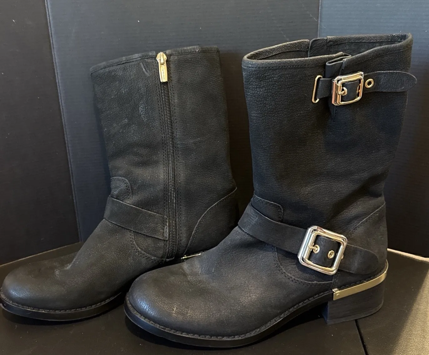 Vince Camuto Womens 8.5 Windy Moto Boots Black‎ Leather Gold Buckles Mid Calf Black - $75 - From Andrea