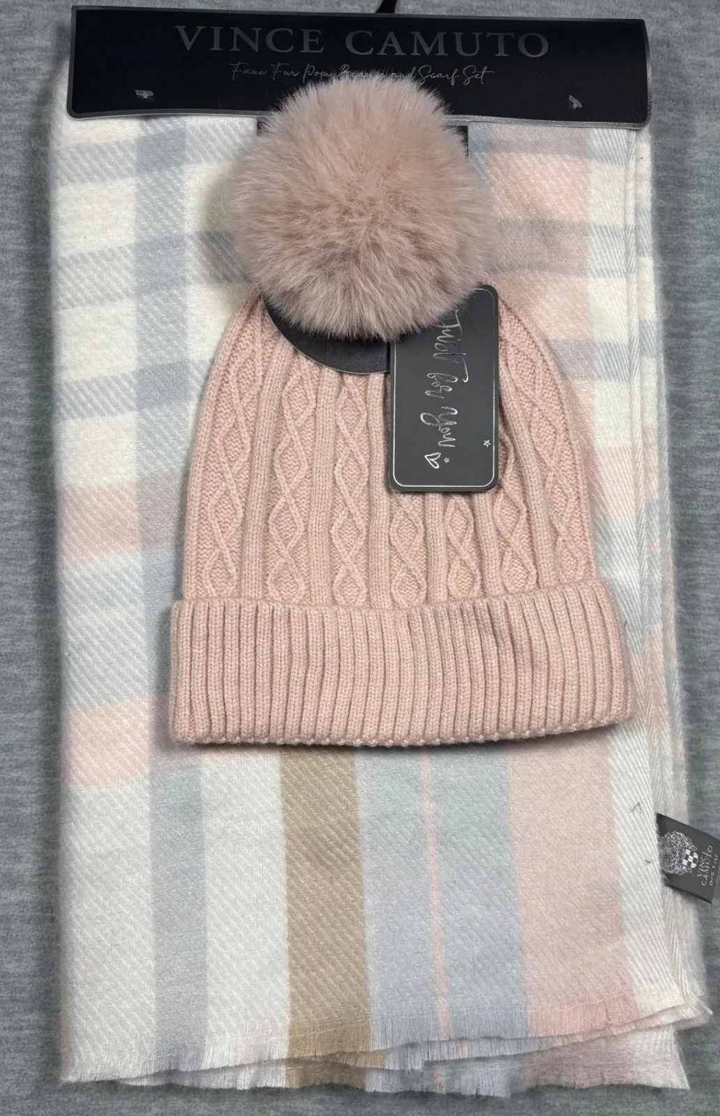 Vince Camuto cable knit beanie and plaid scarf set in a soft pink hue. The beanie features a cozy ca... Show more