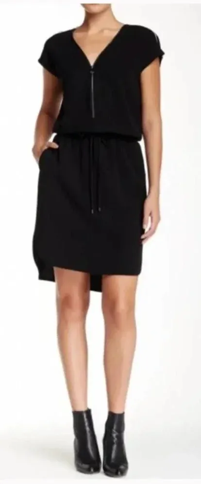 Vince V-Neck Contrast Trim Zipper Shift Dress in Black Ivory stripe details at the shoulders frame t... Show more