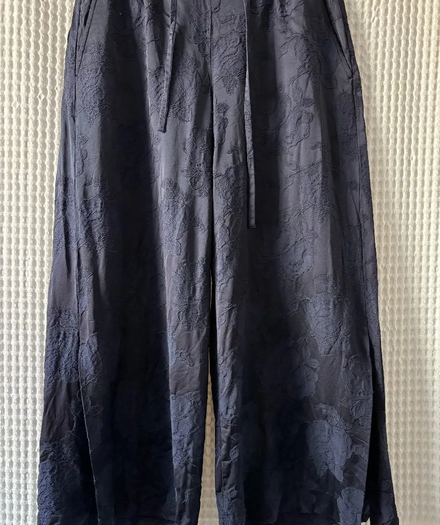 Vince navy blue floral jacquard wide-leg drawstring elastic waist pants. Pockets front and back. 100... Show more