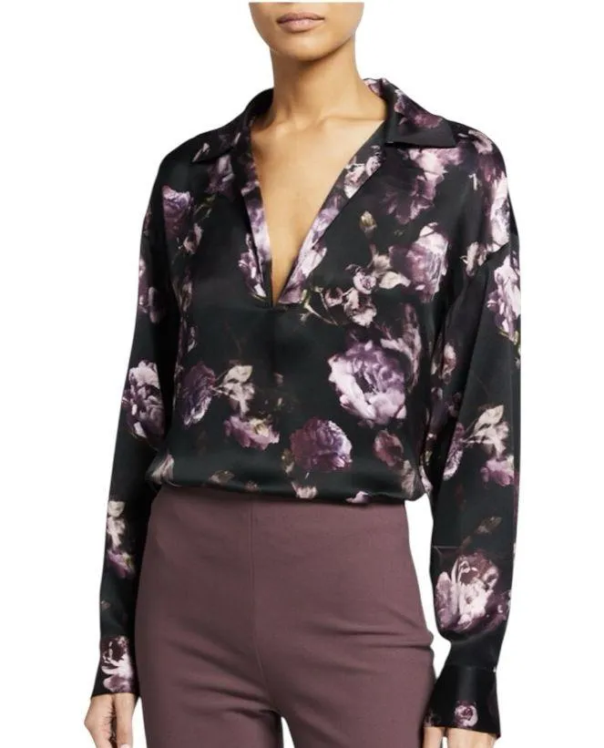 In a pattern of ethereal florals, this silk popover blouse features an open collared neckline, desig... Show more