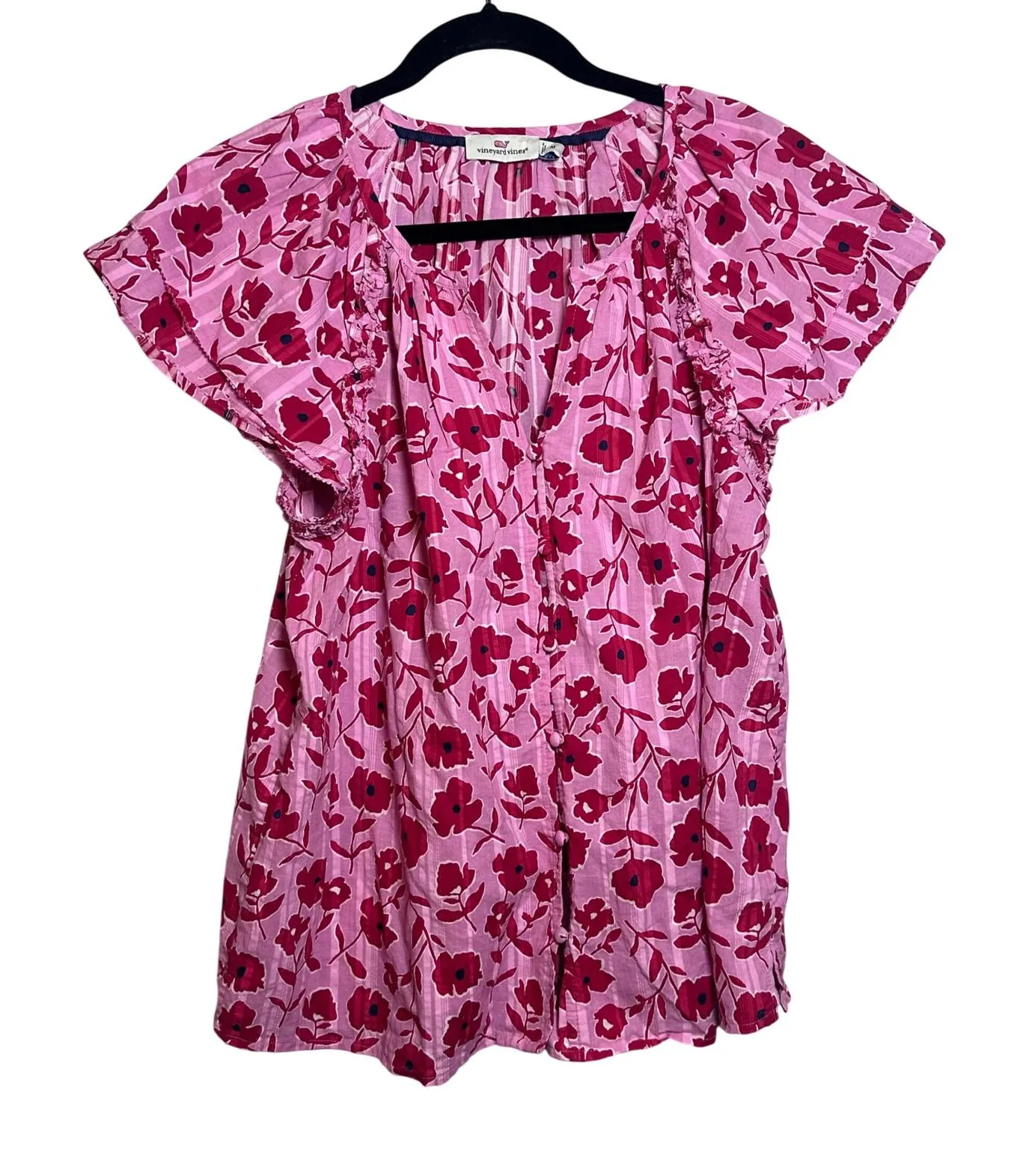 Vineyard Vines pink floral tunic shirt with butterfly sleeves. This charming top features a v-neckl... Show more