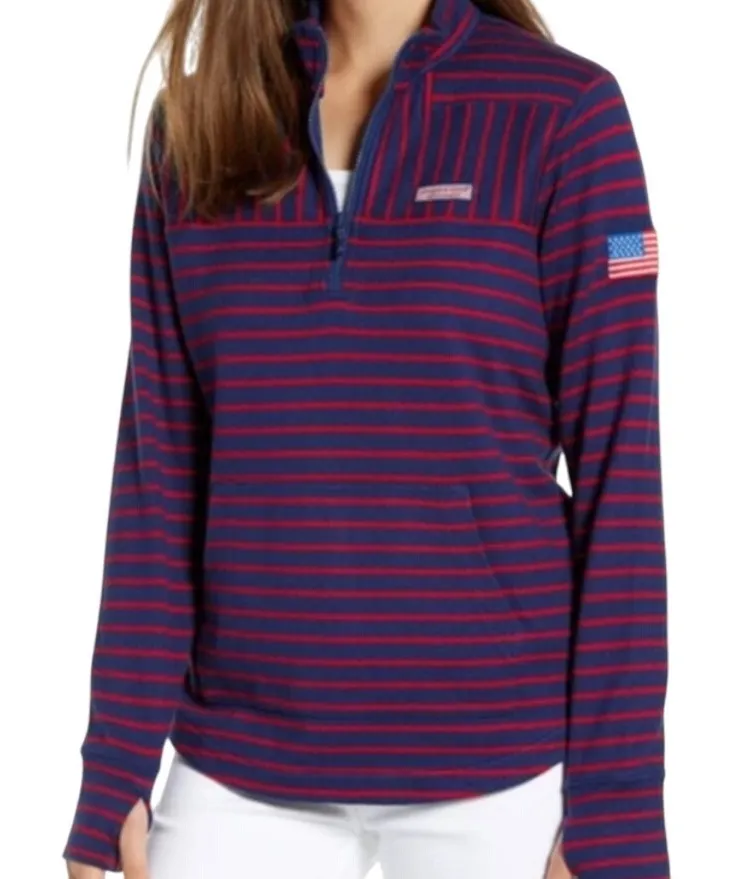 Channel a patriotic preppy vibe in this classic quarter-zip pullover! Featuring a timeless navy and... Show more