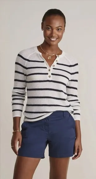 Classic stripes race along this soft knit sweater framed with a button half placket. Button half pl... Show more