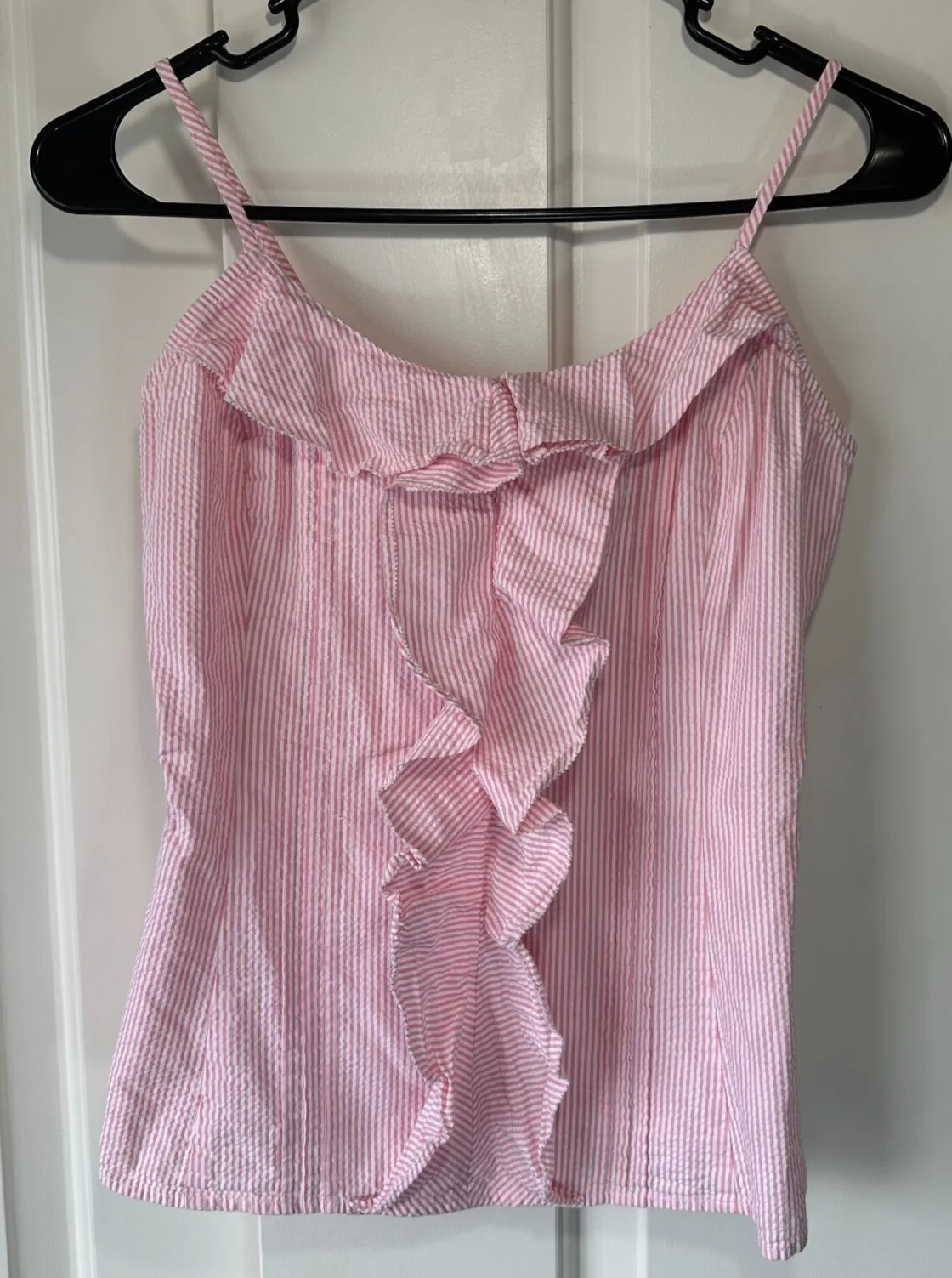 Vineyard Vines Womens Seersucker Ruffle Tank Top Pink White Stripe Sleeveless 2 Review photos for c... Show more