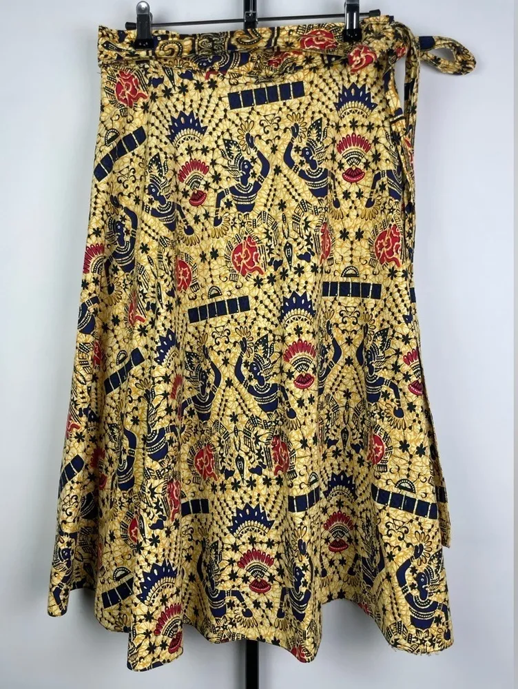 Vintage 100% Cotton Yellow African Egyptian Traditional Printed Wrap Skirt It has two green stain spots that are very small, see photos Measurements taken while the item was laid flat are approximately: Waist (full length unfolded without the straps) 37.5” Length 29”