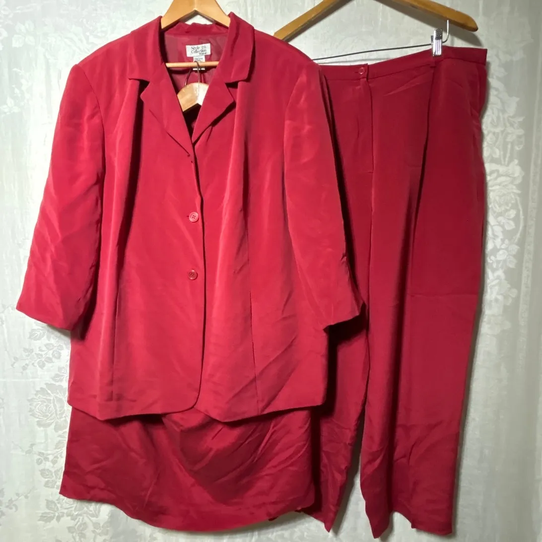 Vintage 100% Silk Suit in Size 22W. This stunning red suit includes a blazer jacket, pants, and a midi skirt, offering versatile styling options. The jacket is a classic Style & Co design. Perfect for adding a touch of elegance to your wardrobe. Grab it now! In good used condition. I do not see any flaws or stains other than light normal wear.