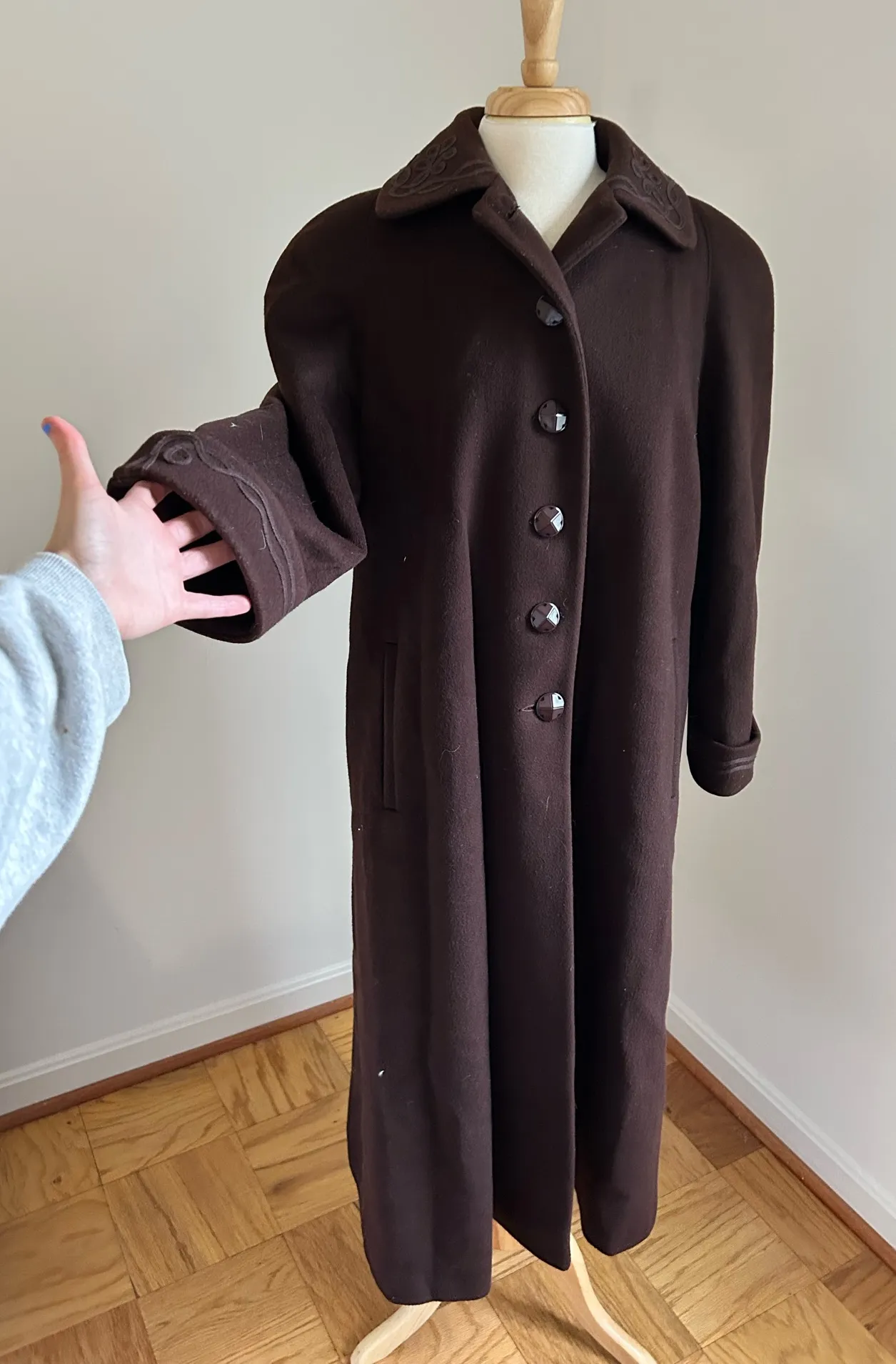 Vintage Brown 100% Wool Maxi Winter Coat In gorgeous condition. Made of 100% wool. No size tag but fits like large/XL. Fits oversized on smaller sizes. Embroidery on the collar. Has shoulder pads, can be removed but undoing the stitch. I adore this coat but never wear it as much as I should Measurements (taken flat) 26” bust 50” length brown wool, maxi coat, vintage outerwear, winter coat, long coat, tailored, minimalist, warm fabric, classic style, neutral tone