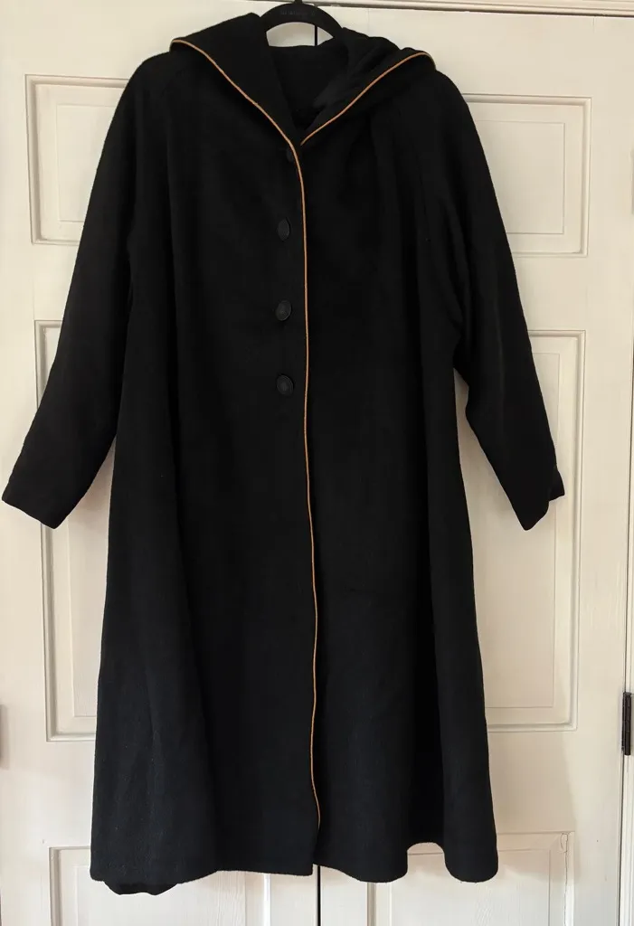 Step into timeless elegance with this stunning 1940s vintage swing coat. Crafted in the USA and union made, this moody black coat features a dramatic hood and striking gold trim for a glamorous, witchy vibe. A true piece of fashion history — perfect for collectors and vintage lovers alike. • Classic 1940s silhouette • Luxurious wool fabric (likely 100% wool) • Gold trim detailing for a bold accent • Hooded design adds both drama and warmth • Union made in the USA Vintage 90 years old condition. A rare, one-of-a-kind vintage find that captures old Hollywood glamour and dark academia charm. Flatlay Measurements (approximate) Chest 27 inches Length 43 inches Sleeve from underarm 19.5 inches Waist 28 inches Hip 32 inches 1940s coat, vintage wool coat, swing coat, gothic coat, witchy aesthetic, moody fashion, old Hollywood, black gold coat, union made, made in USA vintage