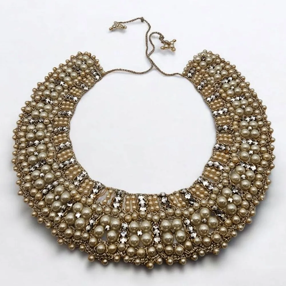 Vintage 1950s faux pearl and clear rhinestones collar necklace that ties in the back of the neck with faux pearls on the ends of the cords. Has one spot where three faux pearls are missing as shown in pictures.