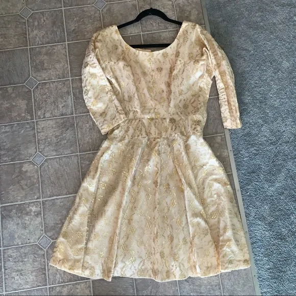 Vintage! I believe from about the 1950s but I am not certain. Unknown material and size because it has no information tag. See photos for approximate measurements!!! Some stains/small spots from age. Primarily on the inside! Beige color with gold detail. Lace-like exterior. Partial length sleeves. Color may vary slightly from photos due to lighting. Zipper still intact but the wire loop at top to hook it is missing (see photo) No other major flaws but small ones are possible. Sorta stiff material NO TRADES/RETURNS Please do further research on this item if you’re interested in confirming the information I found about it online before you purchase Reasonable offers considered