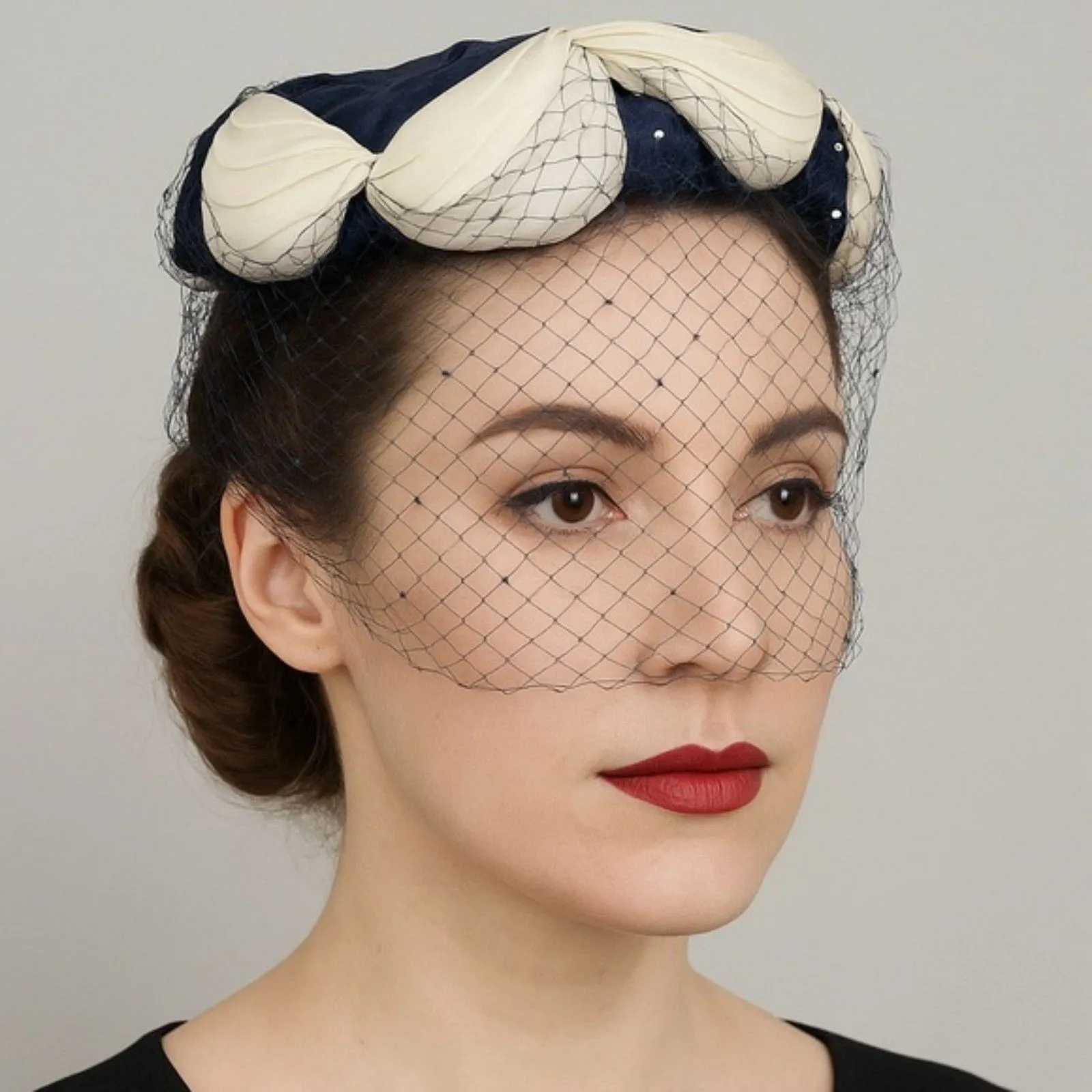 Chic straw pillbox hat in navy straw with silk white rose petal decorations and a rhinestone-studded navy veil in the birdcage fashion. Grosgrain ribbon band inside hat. Lightweight. Adjustable head size as the hat sits atop the crown. Very good condition with no visible issues other than a few breaks in the veil, as is typical of hats that have survived from this period. Hat stand used for display, not included. Modeled photo is AI-generated. BRAND: Vintage COLOR: navy & white CONDITION: previously owned ORIGIN: USA •Color may vary on your screen. •Fast Shipping •Small Business •Carefully Packaged, Smoke-Free •5-Star Seller