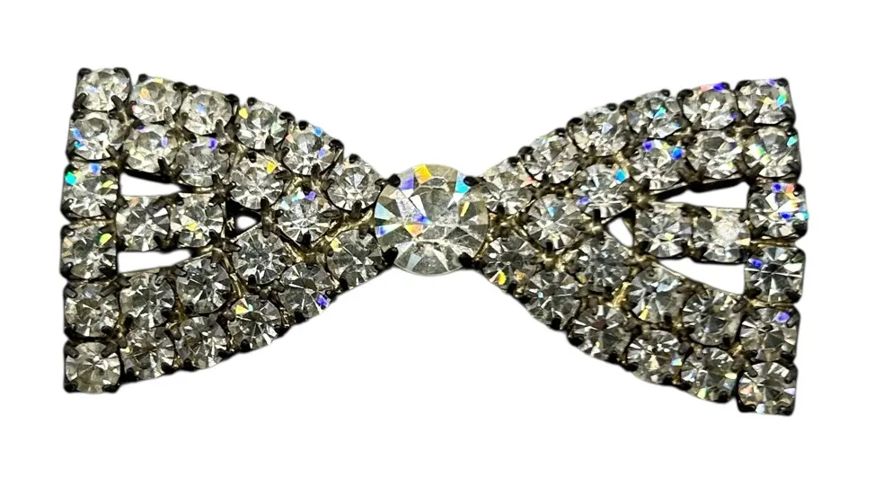 Beautiful vintage rhinestone bow brooch dating to the late 1950s–early 1960s. Features a classic mid... Show more