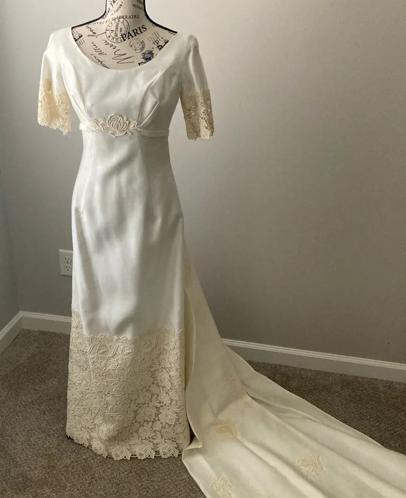 This vintage 1950's short-sleeved ivory linen wedding bridal dress with a train by Bridal Originals... Show more