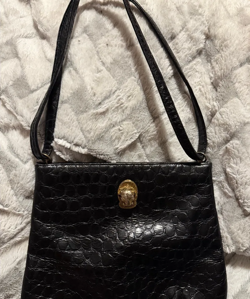 This stylish black crocodile-embossed women's bag is perfect for any occasion. Its sleek design and luxurious texture make it a must-have accessory. Ruth Saltz 1960’s vintage crocodile pattern bag. It has a gold cougar head on the front and the back has gold hardware. It has a magnetic closure. The straps are very short 13 inches and it’s roughly 17 inches tall. It looks like it was just bought off the shelf yesterday. I don’t think anyone ever used this beautiful bag.