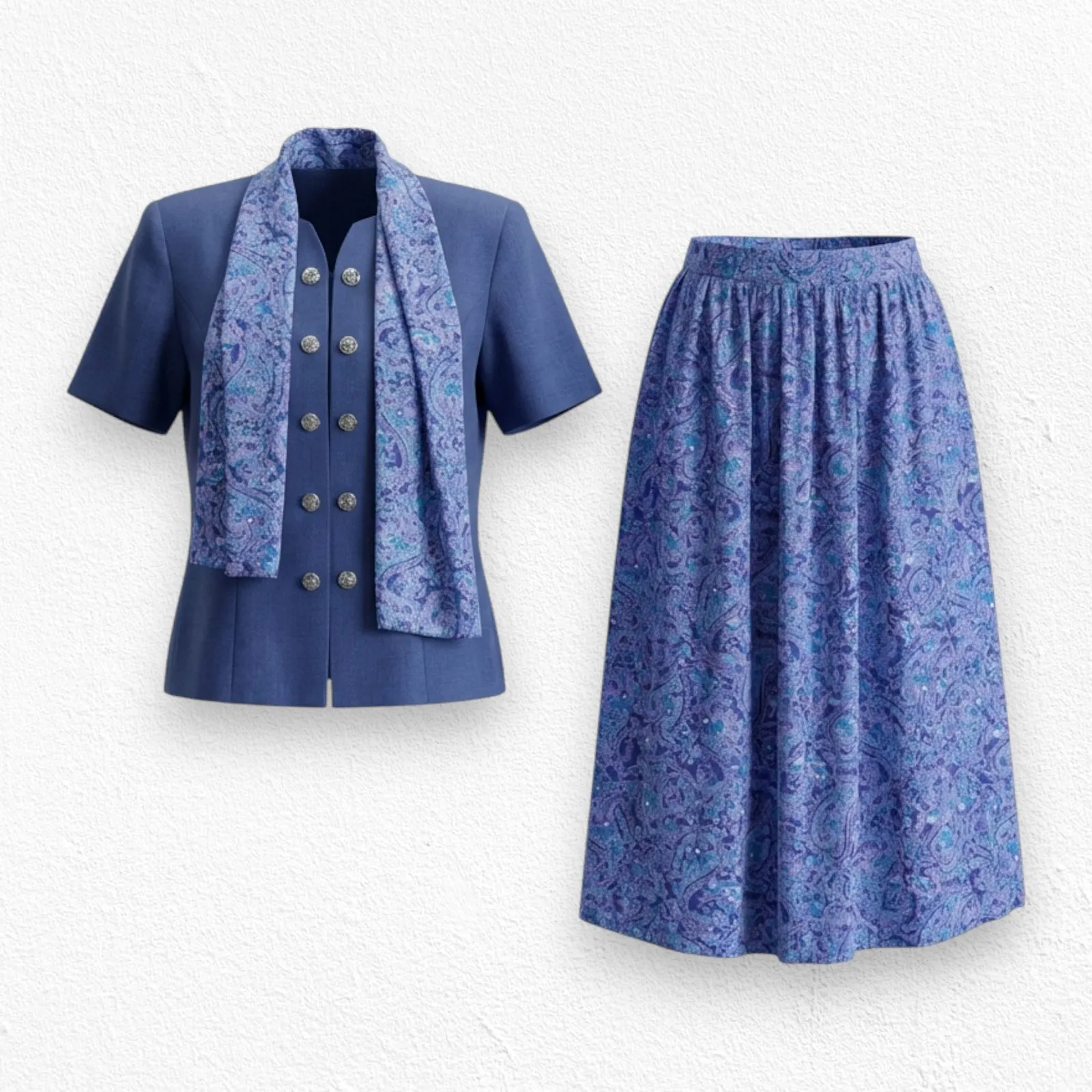 Vintage 80s Blue Paisley 3-Piece Skirt Set Brand: Leslie Fay Size: tagged a vintage size 12; measures more like a modern size 10 Style Name: 0119234 Color: Blue and Purple Excellent Used Condition (EUC) Authentic 1980s three-piece matching set Includes blouse blazer, pleated skirt & matching rectangular scarf Coordinated blue/purple paisley print (skirt + scarf) Short-sleeve blazer blouse with narrow double-breasted closure Silver-tone metal floral buttons Structured shoulder pads for classic 80s silhouette Midi-length skirt with soft pleating Elastic waist for comfort Lightweight, comfortable polyester Perfect for careerwear, church, vintage collectors, styling, or cottagecore looks Pairs well with silver jewelry to complement the metal buttons, nude or navy pumps for a polished 80s office look, or ballet flats or Mary Janes for a softer cottagecore style Armpit to armpit: 20.5" Top to bottom: 24.5" Waist: 13" stretches to 18" Top to bottom: 30" 100% Polyester Smoke-free home **All measurements are taken laying flat using a fabric measuring tape. Please note that these measurements are approximate based upon my measurements.