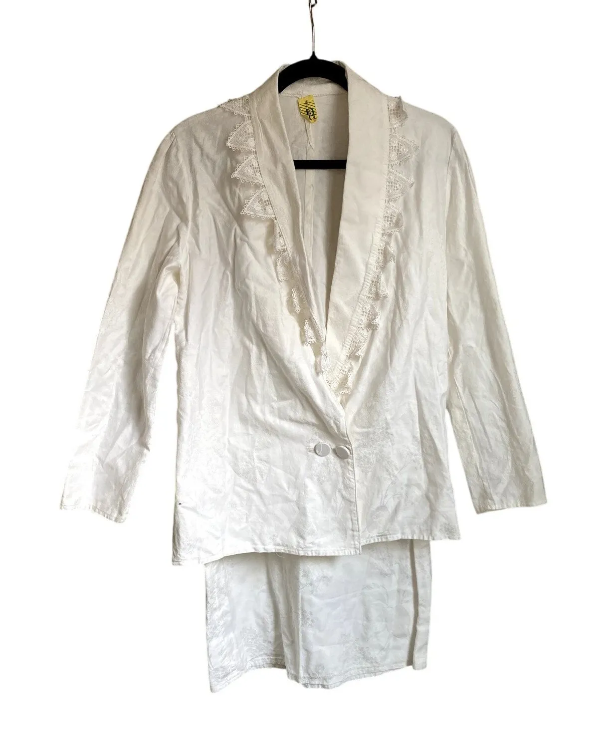 Vintage 80s Lace Ruffle White Blazer Skirt Suit Set. Glamorous vintage suit set from the 1980s featuring a blazer and midi skirt. The blazer boasts delicate lace trim around the collar and a button closure. The skirt has a zipper closure. Great vintage condition, minor discoloration on skirt. Approximate measurements: Skirt waist 13 inches, length 28 inches. Blazer pit to pit 19 inches, length 26 inches. Fits like a modern small or 2/4 White ivory floral embossed fabric. Perfect for coquette, glam, and workwear styles. Vintage Suit Set, 1980s Fashion, Lace Trim Blazer, Midi Skirt, Coquette Style, Glam Outfit, Workwear, White Suit, Ivory Suit, Floral Fabric, Embossed Fabric, Vintage Blazer, Vintage Skirt, 80s Suit, Blazer and Skirt Set. #vintage #80sfashion #suits #skirtsuit #lace #coquette #glam #workwear #whitesuit