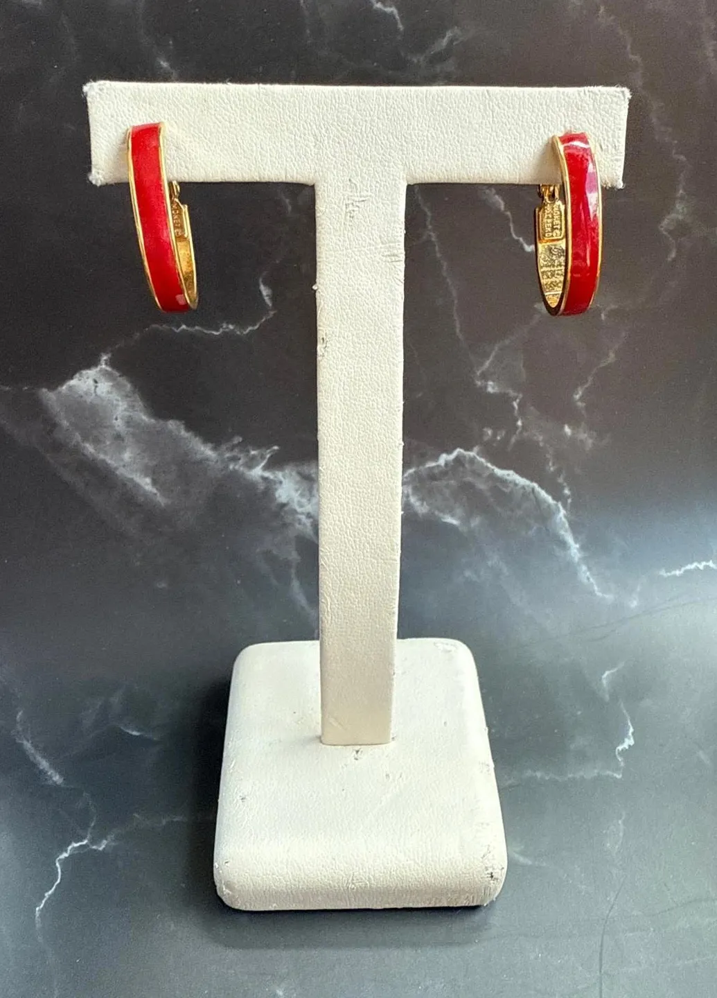 Add a touch of vintage charm to your jewelry collection with these stunning 1980's Monet clip-on hoop earrings! Featuring a beautiful gold tone and vibrant red enamel, these earrings are the perfect statement piece. They are in great condition and ready to wear! Approximate measurements: Diameter: 1 inch