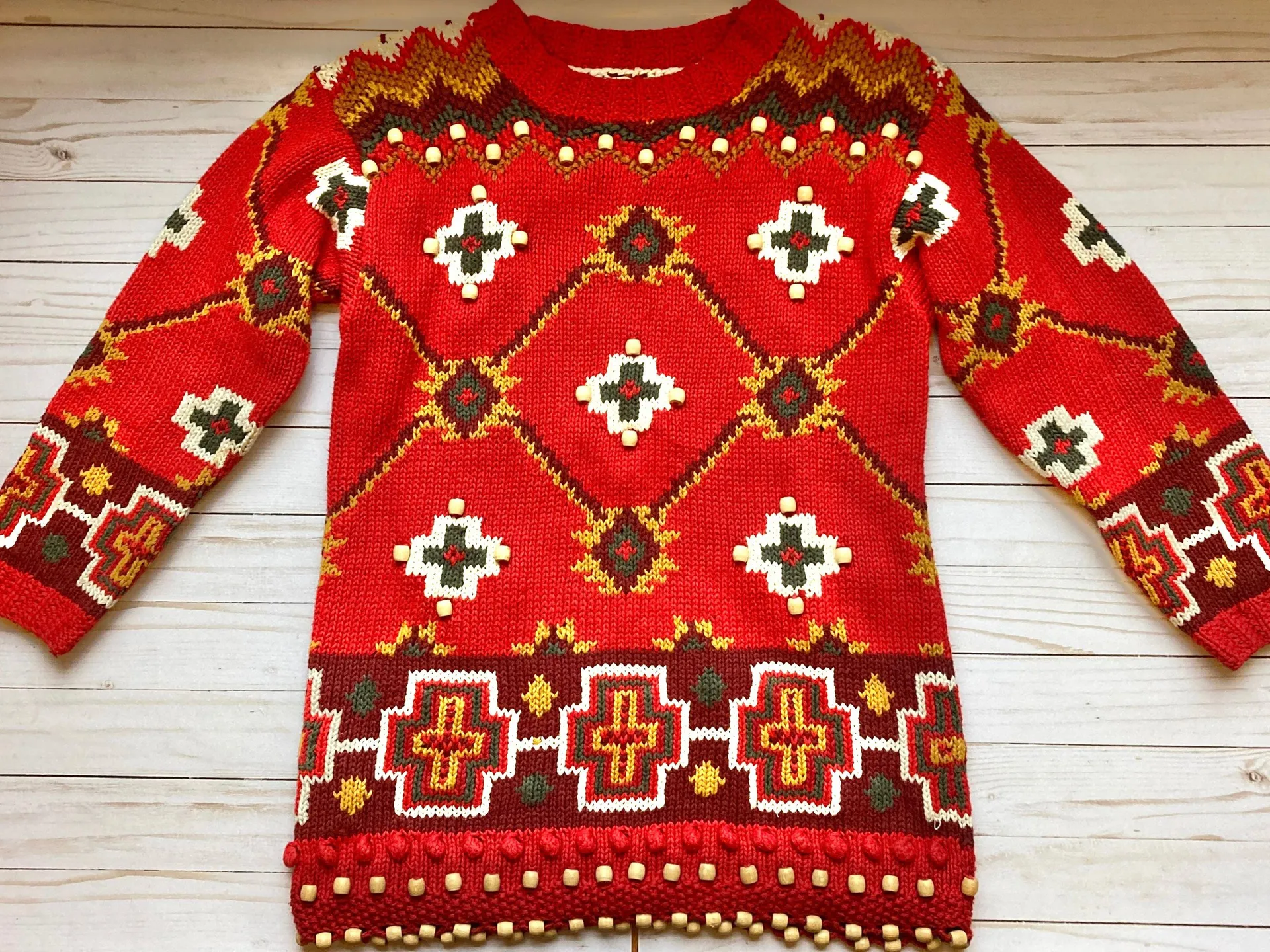 Selling this gorgeous vintage chunky knit sweater with wooden beads. Perfect for any holiday event. Very heavy material. There is no size tag so please refer to the measurements below to determine the most accurate fit on your body. Approximate measurements: Chest: 17.5" flat Length: 25.5"