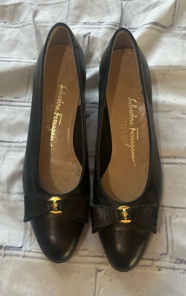 OPEN TO ALL OFFERS Classic vintage Salvatore Ferragamo pumps from the 1980s, crafted in black leather with an elegant gold-tone bow detail at the toe. This is an iconic, timeless silhouette that reflects Ferragamo’s Italian craftsmanship and refined design language from the era. These heels have a structured, polished look that works equally well with tailored trousers, skirts, or dresses. The low-to-mid heel makes them wearable while still maintaining a sophisticated profile. A true collector piece for vintage designer lovers or anyone looking for an elevated everyday heel with history behind it. Marked Made in Italy, with original interior branding and size stamp. Overall vintage condition with visible wear to the soles consistent with age and use, as shown in photos. Leather uppers remain presentable and intact. Details: • Brand: Salvatore Ferragamo • Era: 1980s vintage • Size: 8.5 • Color: Black • Material: Leather upper • Made in: Italy • Heel style: Classic pump • Toe detail: Gold-tone bow hardware Vintage designer, Ferragamo heels, 1980s pumps, black leather shoes, Italian luxury, classic bow heels, rare vintage footwear, timeless elegant women’s heels Condition Vintage condition with sole wear and signs of prior use consistent with age. No major structural damage noted.