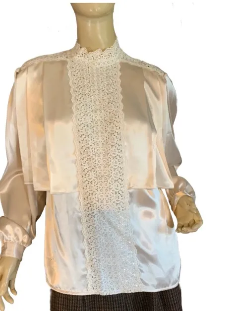 This listing is for the blouse pictured only. Sonya Ratae for San Andre -cream -satin -mock neck -laced front with flowing, blousing panel -back button closure -vintage 1980's Blouse is marked size small (38 inch bust) --please use measurements provided in photos for fit determination; Size tags alone, are not a reliable source. Blouse has a mark to the back at the shoulder. Preowned items (especially vintage pieces) are subject to any minor imperfections which come with an article of clothing that has been washed and worn; these signs of wear generally include light pilling or fuzzing, loose threading or wrinkling. Some listings may not include these issues, but as a general disclaimer, please be aware it is possible. Unless indicated, there is no major damage to a piece. To mitigate the cost of the items and avoid any issues customers may have with allergies, we leave desired cleaning to the new owners.