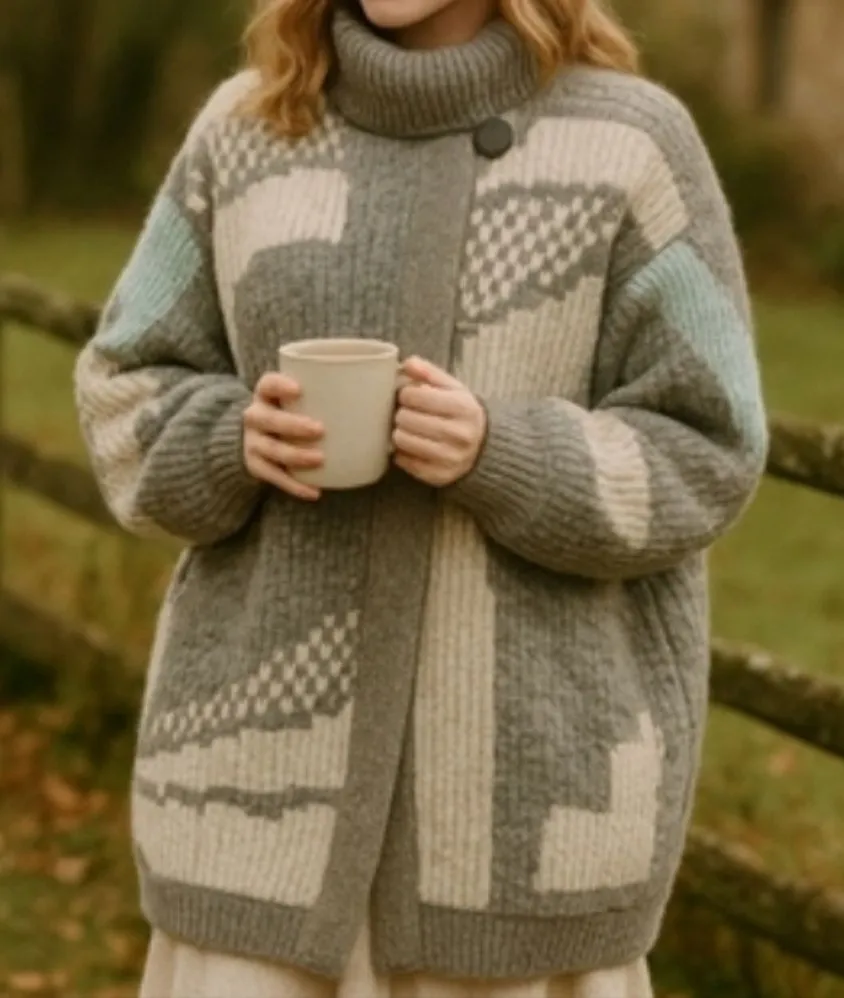 This Authentic vintage 1980s Townhouse knit coat is a dreamy mix of cozy and chic — the kind of piece that defines true retro comfort. Crafted in Taiwan during the height of mid-’80s design, it’s made from a plush chenille-style acrylic knit, fully lined for warmth, and styled with that iconic oversized silhouette everyone loves right now. Soft geometric patterns in gray, white, and pale ice blue wrap around the coat in a textured design that feels both modern and nostalgic. The rib-knit roll collar closes with one large gray button, and the built-in shoulder pads give it just the right amount of structure without being bulky. The padded interior adds a light layer of warmth, giving it the feel of a lightweight jacket — not just a sweater. Era: 1980s Brand: Townhouse Made in: Taiwan R.O.C. Shell: 100% Acrylic Lining: 100% Nylon Filler: 100% Polyester Measurements (approx): Pit to pit 25” | Shoulder to hem 29.5” Size: Small (fits small-Large depending on how you like the fit) Condition: Excellent vintage condition; clean, soft, and ready to wear very very nice. Model photo shown for fit and style. See listing photos for the exact coat you will receive. Keywords: vintage knit coat, 1980s chenille jacket, geometric sweater coat, Townhouse vintage, cozy retro cardigan, gray white oversized coat, 80s coatigan, made in Taiwan vintage, grandmacore sweater, mid century winter knit, cozycore, winter streetw