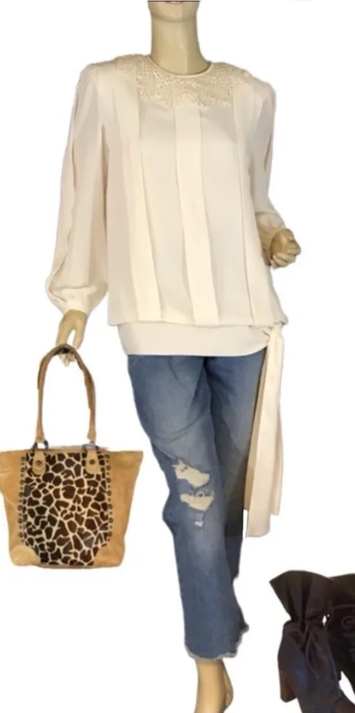 This listing is for the blouse pictured only. Chimney Ridge -vintage 1990's -cream -pleated panels -blouson -tie sash at side waist -crochet lace doily collar -button at the back of the neck -pull over -button cuff sleeve Blouse is marked size 12 (43 inch bust) --please use measurements provided in photos for fit determination; Size tags alone, are not a reliable source. Item is free of holes. There is a small black dot on the front panel of blouse. See photos. Preowned items (especially vintage pieces) are subject to any minor imperfections which come with an article of clothing that has been washed and worn; these signs of wear generally include light pilling or fuzzing, loose threading or wrinkling. Some listings may not include these issues, but as a general disclaimer, please be aware it is possible. Unless indicated, there is no major damage to a piece. To mitigate the cost of the items and avoid any issues customers may have with allergies, we leave desired cleaning to the new owners.
