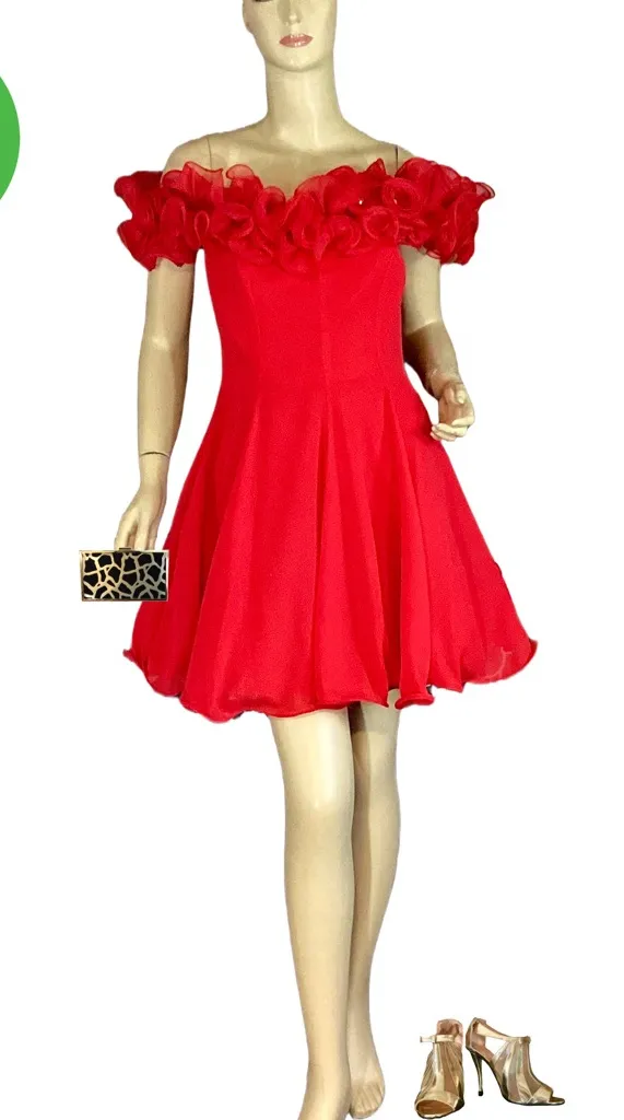 This listing is for the dress pictured. Lillie Rubin -vintage 1990's -party/formal dress -red -full tulle skirt -off-the-shoulder rosette trimmed bust line -back zipper closure -fit and flare -rhinestone accent in rosettes -mid thigh length depending on the individual Dress is marked size 6 (32 inch bust) --please use measurements provided in photos for fit determination; Size tags alone, are not a reliable source. Item is free of stains or holes. Preowned items (especially vintage pieces) are subject to any minor imperfections which come with an article of clothing that has been washed and worn; these signs of wear generally include light pilling or fuzzing, loose threading or wrinkling. Some listings may not include these issues, but as a general disclaimer, please be aware it is possible. Unless indicated, there is no major damage to a piece. To mitigate the cost of the items and avoid any issues customers may have with allergies, we leave desired cleaning to the new owners.
