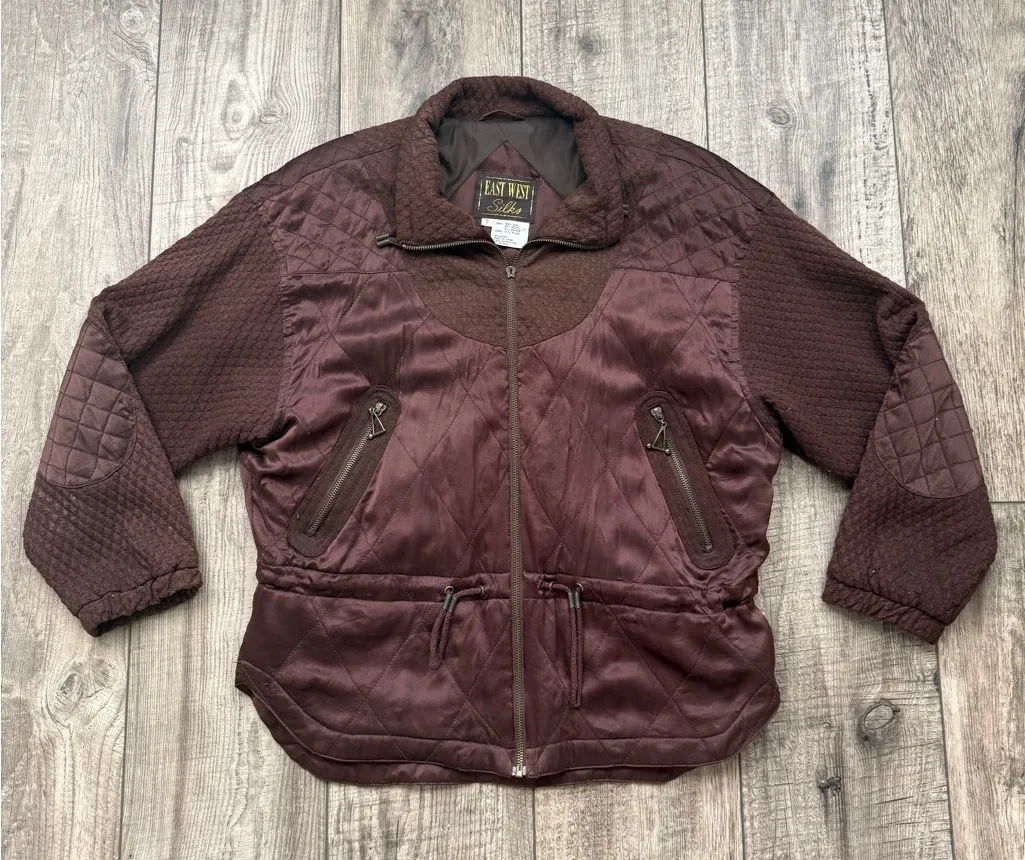 Rich, warm brown silk jacket with quilting and drawstring waist. This piece has some flaws but is totally still wearable :) DETAILS • authentic 1980s vintage • by East West Silks • genuine silk with a cotton-poly blend for accents and nylon lining • comes as-is with some damage to the zipper pulls, loose grommets, and minor discoloration near an elbow FIT • vintage size small • length 28” • pit to pit 22” TAGS 80s 1980s eighties glam bold chocolate brown silk satin quilted normcore preppy academia varsity jacket coat fall autumn winter OOAK vintage twee indie