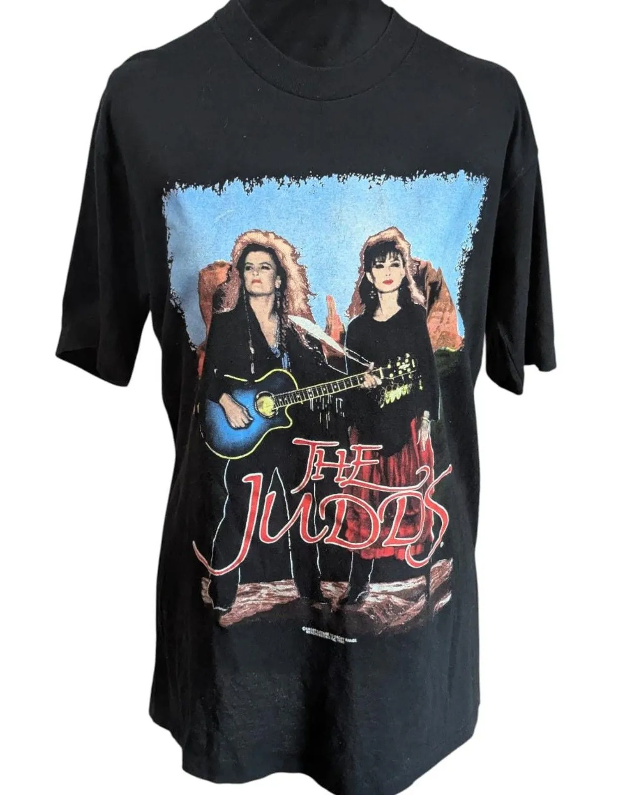 Step into the sunset of country music history. You can already feel the lived-in softness of this 100% cotton Tennessee River classic, a fabric that has carried the echoes of Naomi and Wynonna's final harmonies for over three decades. As your eyes follow the vibrant, neon-tinged graphics of the 1991 "Farewell Tour," you are drawn into a hypnotic loop of nostalgia, feeling the weight of a legacy that redefined a genre. This isn't just a shirt; it’s a portal to the "Love Can Build A Bridge" era, an authentic single-stitch artifact from O’Farrell Street to West 34th Street. Imagine the effortless cool of pairing this "Coastal Cowgirl" staple with worn denim or a leather jacket. You recognize that true vintage is a feeling, not just a look. You are ready to preserve the harmony. You deserve to own this piece of the legend. Highlighted Features Artist: The Judds — Naomi & Wynonna. Tour: Authentic 1991 "Farewell Tour" commemorating the "Love Can Build A Bridge" album. Vintage Detail: Rare