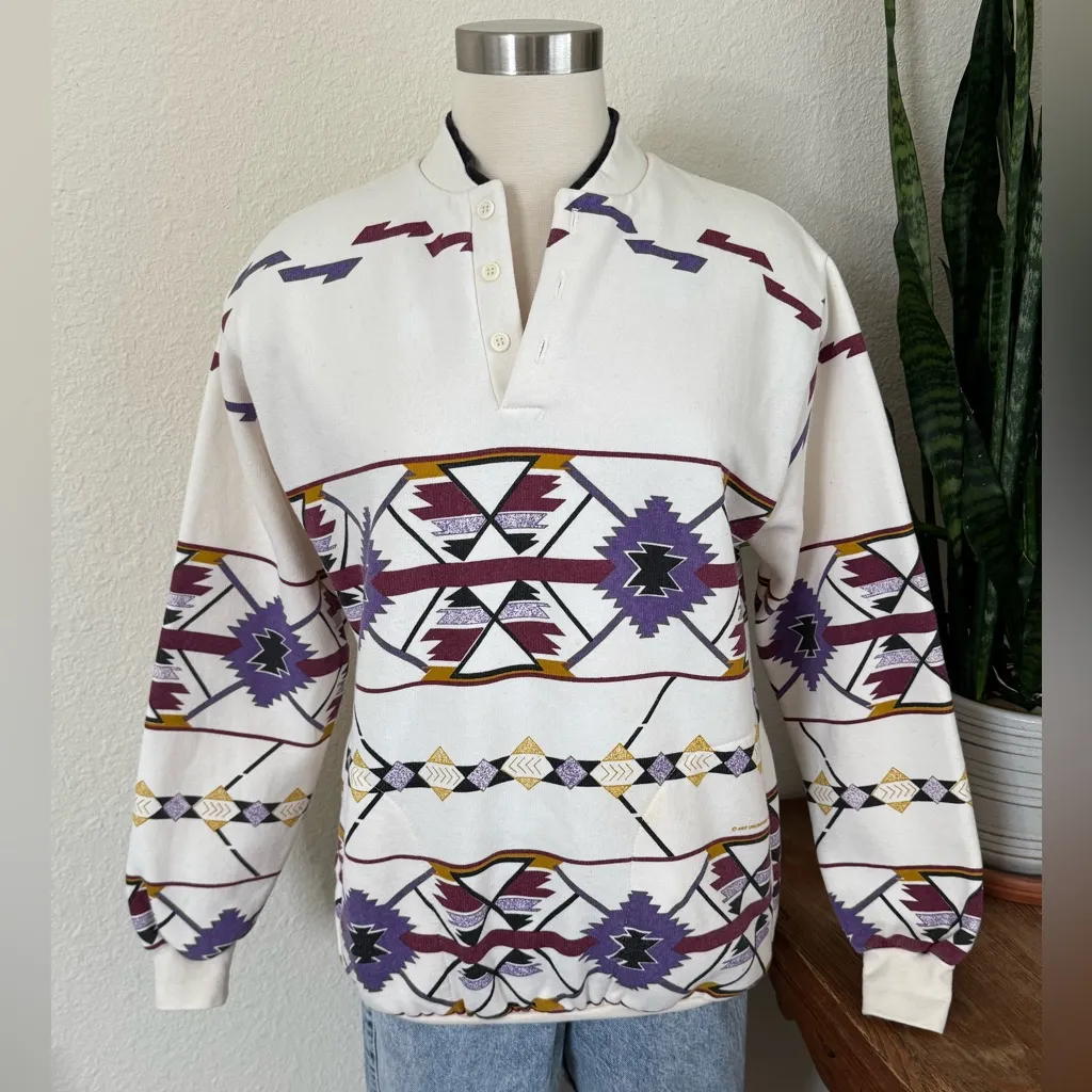 Vintage Art Unlimited 1992 Southwest Aztec pullover sweatshirt featuring bold geometric prints in pu... Show more