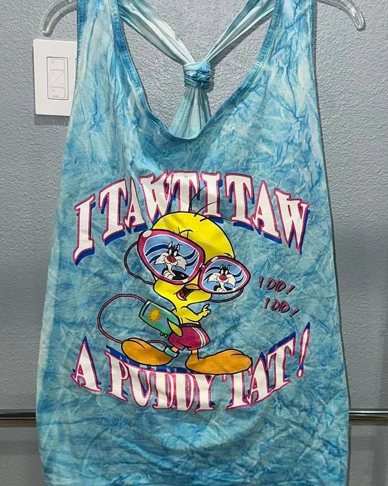 Vintage 1997 Warner bros Looney Tunes ladies adjustable one size fits all muscle shirt. Tweety- Sylvester- does have some wear yellow spots in the front - good wash could possibly remove them still a great vintage wear!! #looneytunes #tweety #1990s #warnerbros #vintage