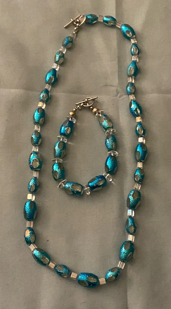 This stunning jewelry set features a beautiful combination of blue and silver beads, perfect for add... Show more