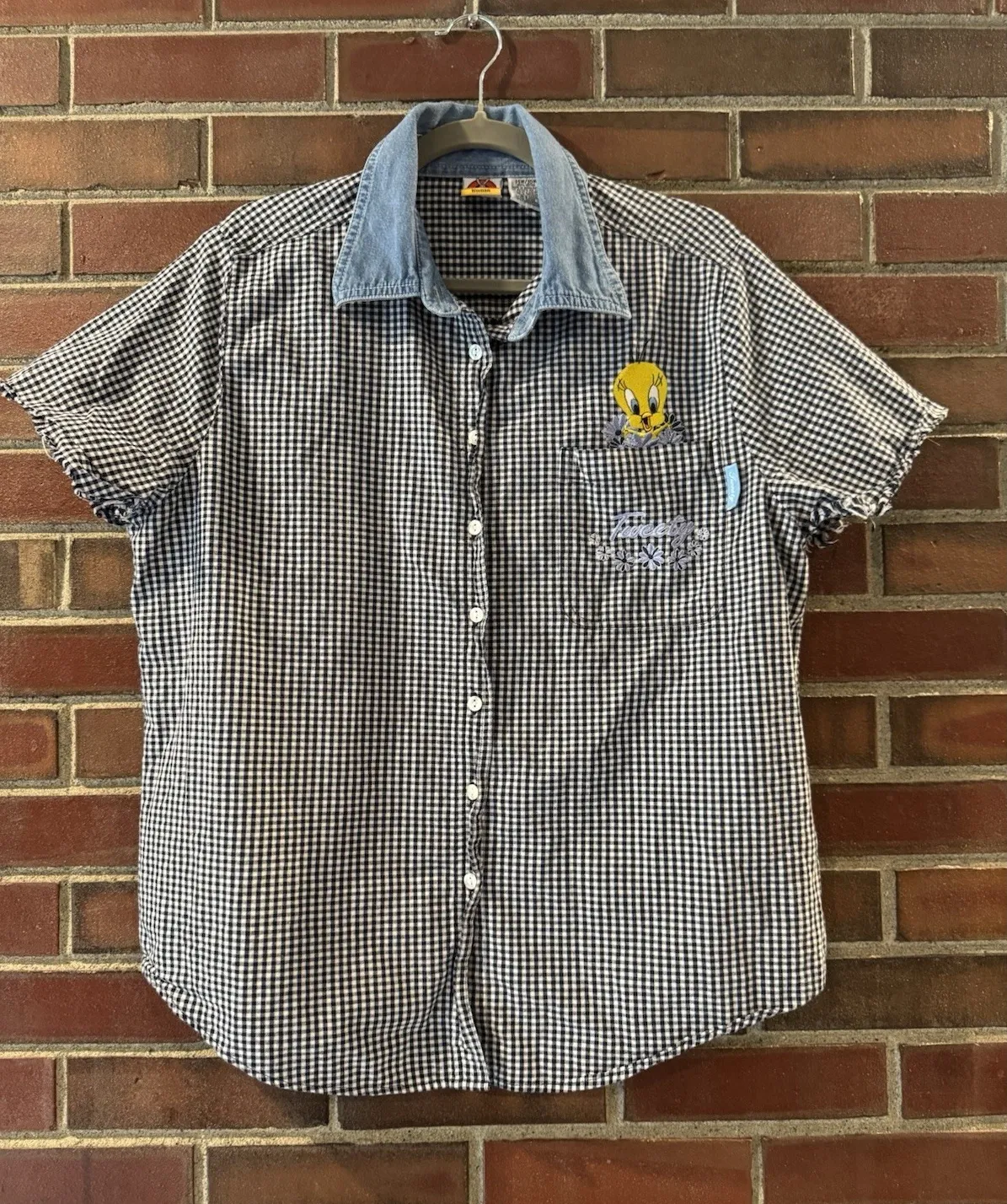 Rare vintage year 2000 Looney Tunes women's shirt in size 14W/16W featuring classic black and white gingham pattern with denim collar and cuffs. Adorable Tweety Bird embroidered on chest pocket. Short sleeve button-down style with 100% cotton construction. Official Warner Bros. licensed merchandise from over 20 years ago! Perfect for collectors or fans of vintage cartoon apparel. Good condition with authentic retro charm.