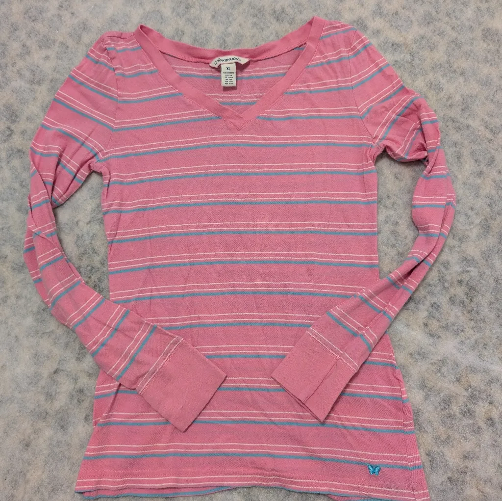 This is such a throwback Aéropostale find — the soft cotton striped long sleeves everyone lived in around 2003–2006. The pink with the aqua and white stripes is peak early-2000s, and the little butterfly logo at the hem is the cutest thing ever. It’s that classic mall-girl tee you’d wear with low-rise jeans, denim skirts, or layered under a zip hoodie. Super comfy, stretchy, and perfect for anyone chasing that Y2K nostalgia in a grown-up XL size. vintage aeropostale y2k top 2000s long sleeve striped tee mall core delias style abercrombie era hollister era preppy y2k aero butterfly pink striped shirt soft cotton tee retro y2k fashion nostalgia top vintage 2000s shirt cute preppy top aero long sleeve early 2000s style y2k aesthetic clothing model photo is just for style inspiration. all other photos are the exact shirt you will be getting 💕