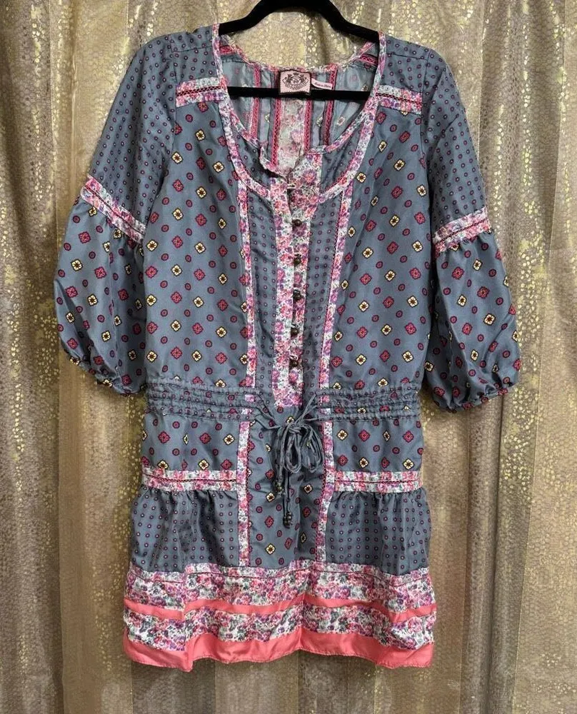 Vintage 2000s Juicy Couture Floral Pink Blue Gray Mini Dress Silk Size 6 Good used condition, smoke... Show more