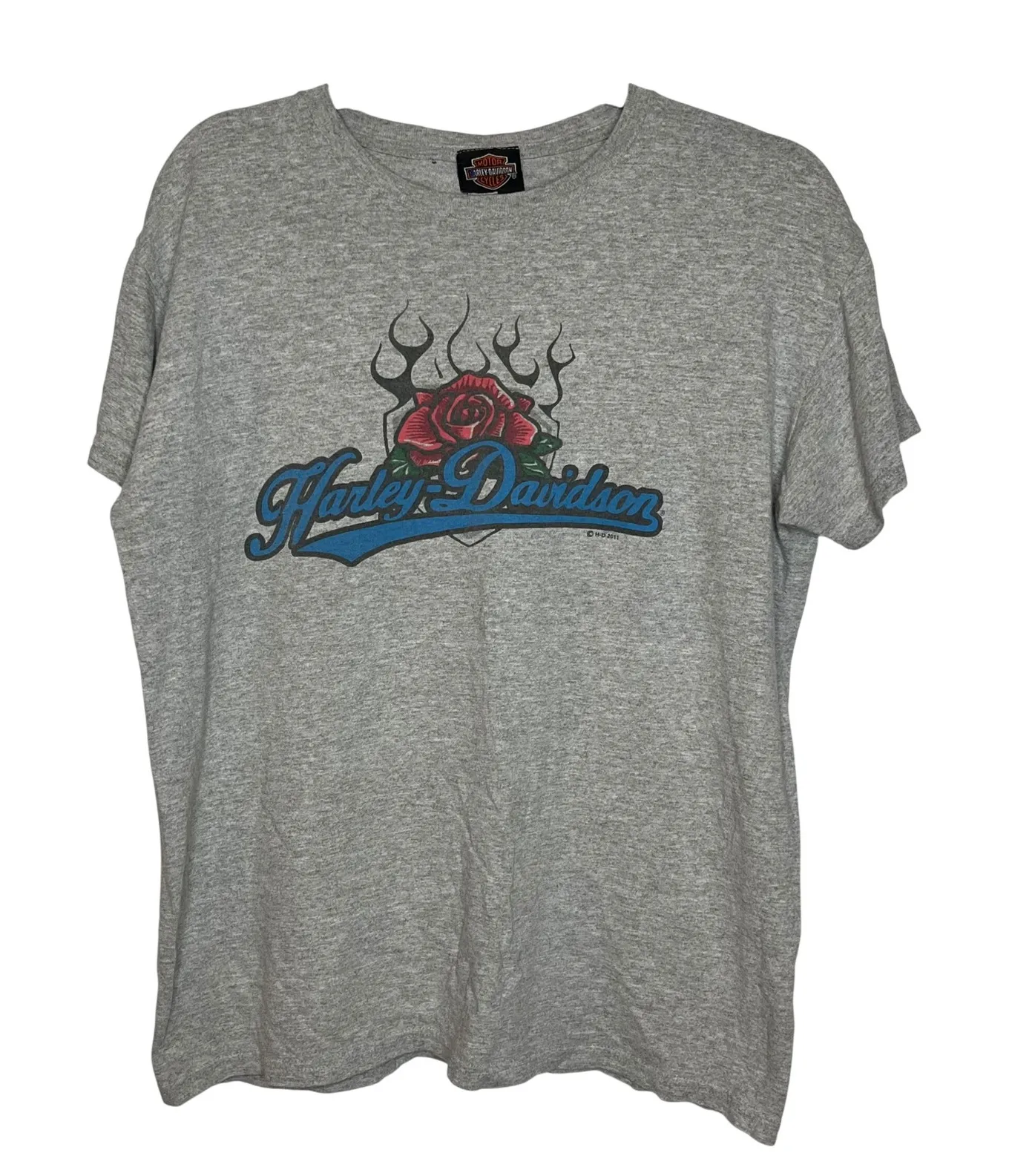 Harley Davidson short sleeve t-shirt in gray featuring a bold graphic of a red rose with flames and the Harley Davidson logo. The shirt has a crew neckline and is made from a comfortable cotton blend. Keywords: Harley Davidson, rose graphic, flame shirt, motorcycle tee, casual wear, graphic tee, women's t-shirt, summer shirt, biker style, streetwear, rocker style, vintage graphic, comfort fit, Vintage 2011