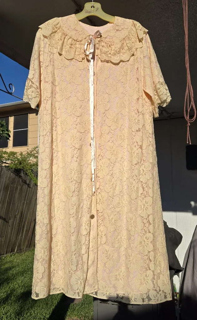 Vintage 50s-60s Lace Overlay Dressing Gown Robe M Housecoat Pink Peach Size M - $32 - From Christine