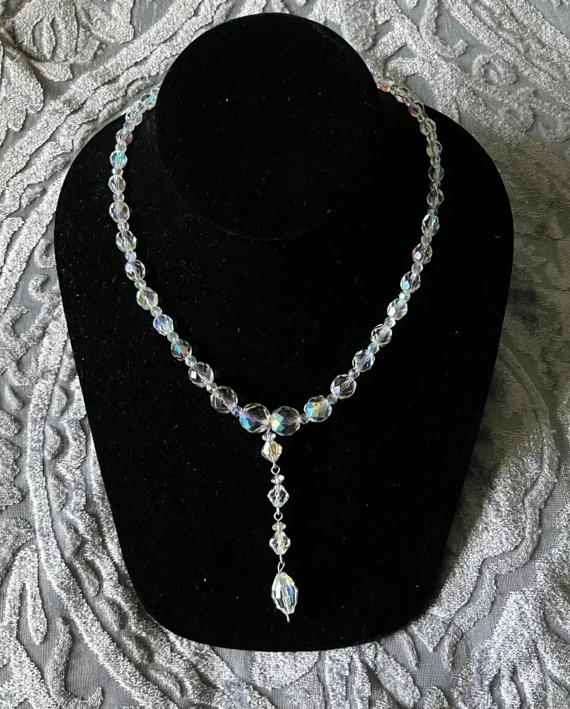 crystal beaded necklace, ab crystal, aurora borealis, y drop, formal, semi-formal, cocktail, mid century modern, mcm, bridal, wedding guest, party, prom, costume, 50s, 60s, retro, old Hollywood, glam, glamorous, iridescent