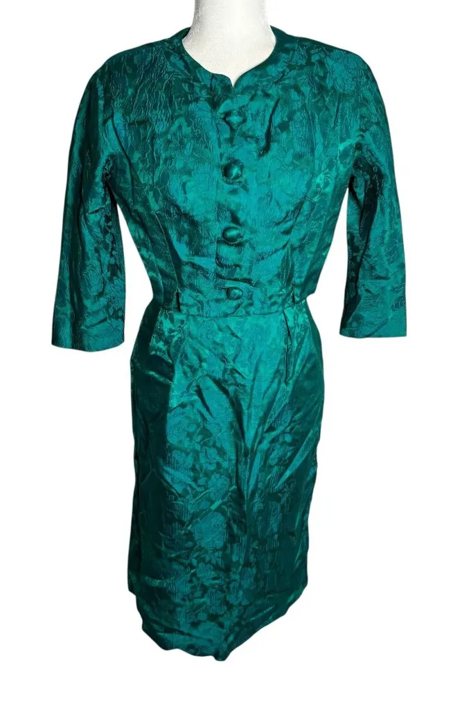 • Short sleeve dress with pleated detailing • Matching jacket with 3/4 sleeves and button closure • Elegant floral brocade pattern • Back zipper closure on dress True vintage, Good condition Light discoloration under the arms and on the back Dark spot on the front of the jacket Jacket: Chest: 17.5" lying flat Sleeves: 21" from the collar Length: 15" shoulder to hem Dress: Chest: 17" lying flat Sleeves: 10" Length: 39" shoulder to hem Waist: 13.5" lying flat