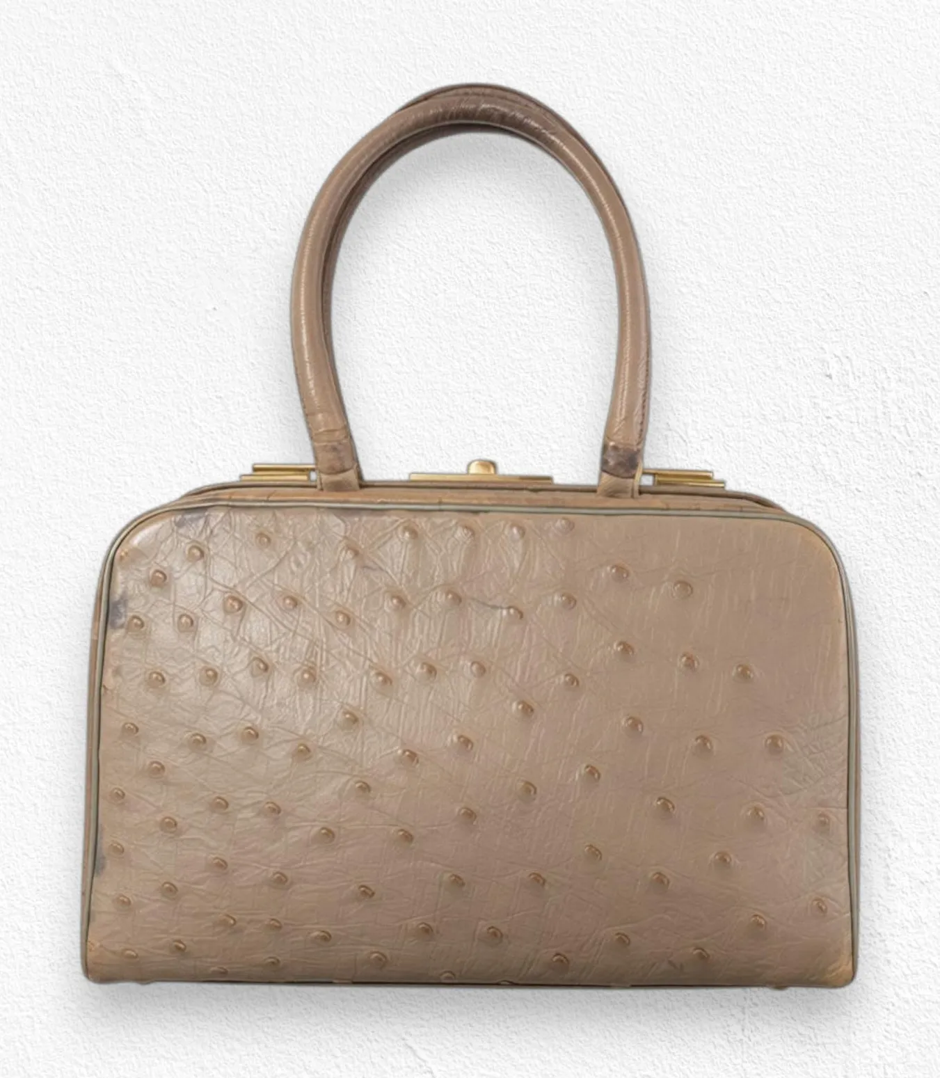 Vintage 1950s Genuine Ostrich Leather Top Handle Purse Brand: Koret Size: Medium handbag Style Name: None Color: Beige/Tan Good Used Condition Handle wear, surface scuffs, interior marks consistent with age Structurally intact, hardware functional, and coin purse still attached Genuine exotic ostrich leather with distinctive quill follicle pattern Structured frame design with dual top handles Gold-tone clasp closure and hardware Includes original kiss-lock coin purse attached with chain Fully lined in beige leather with interior zip pocket Flat bottom with metal feet for structure and durability Circa 1950s European craftsmanship A rare 1950s exotic leather handbag with original chain coin purse — a true mid-century luxury collectible. Dimensions: 9" W× 6.5" T × 3.75" T Handle Drop: 6" Genuine exotic ostrich leather Smoke-free home