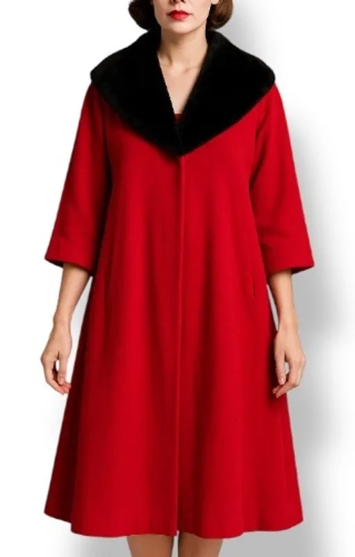 Vintage 1950s Bain Las Vegas red coat with black faux fur shawl collar Red and black Mid century silhouette Swing coat shape Single hook front Satin lining Can fit a modern medium or large Flat lay measurements 22 inches pit to pit 41.5 inch length A statement vintage coat for festive nights out and timeless winter styling