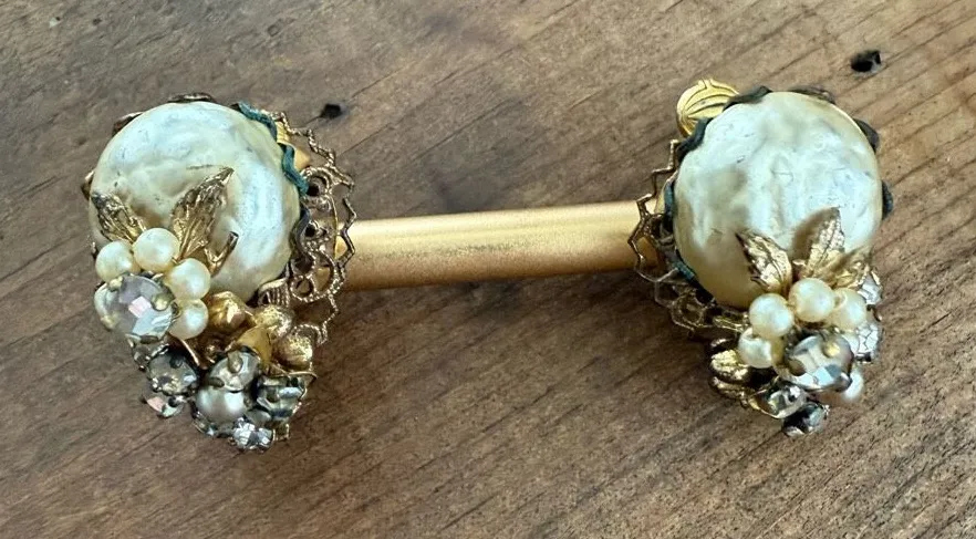 Lovely vintage baroque Robert clip on cluster earrings featuring a large center round faux pearl flanked by prong-set rhinestones and tiny faux pearls. The earrings are plated in warm shade of the “Russian Gold” plating that gives them an antiqued appearance. As early as 1946 Fashioncraft was making jewelry marketed as under “Originals By Robert” that resembled antiqued jewelry in a variety of styles. These earrings have a similar look and style to DeMario or Haskell as well wedding bridal Regency special occasion formal prom
